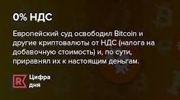Европейский суд освободил Bitcoin и другие криптовалюты от НДС (налога на добавочную стоимость) и, по сути, приравнял их к настоящим ...